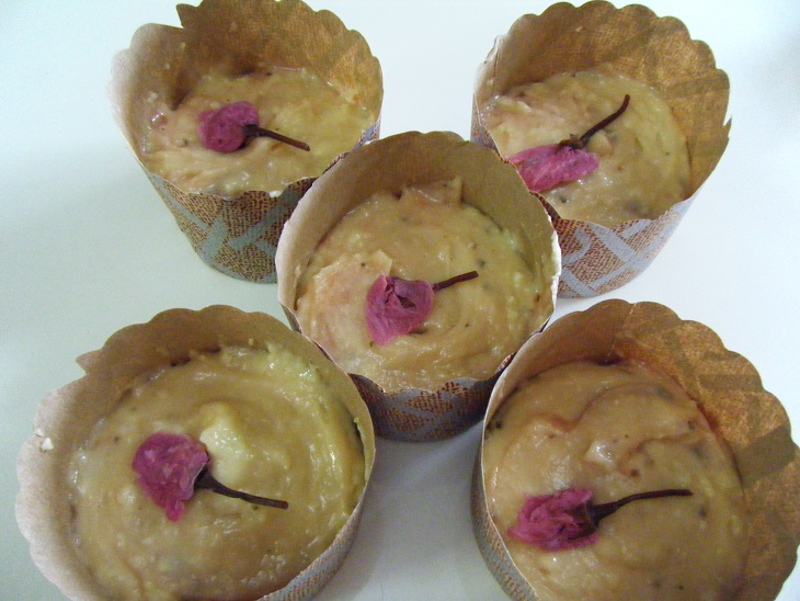 | (6)マフィン型に6分目くらいまで生地を入れ、空気抜きをし、桜花の塩漬を飾る。 |