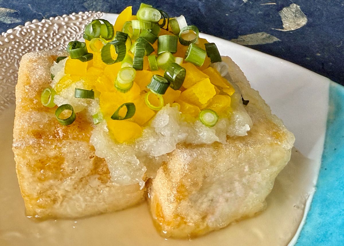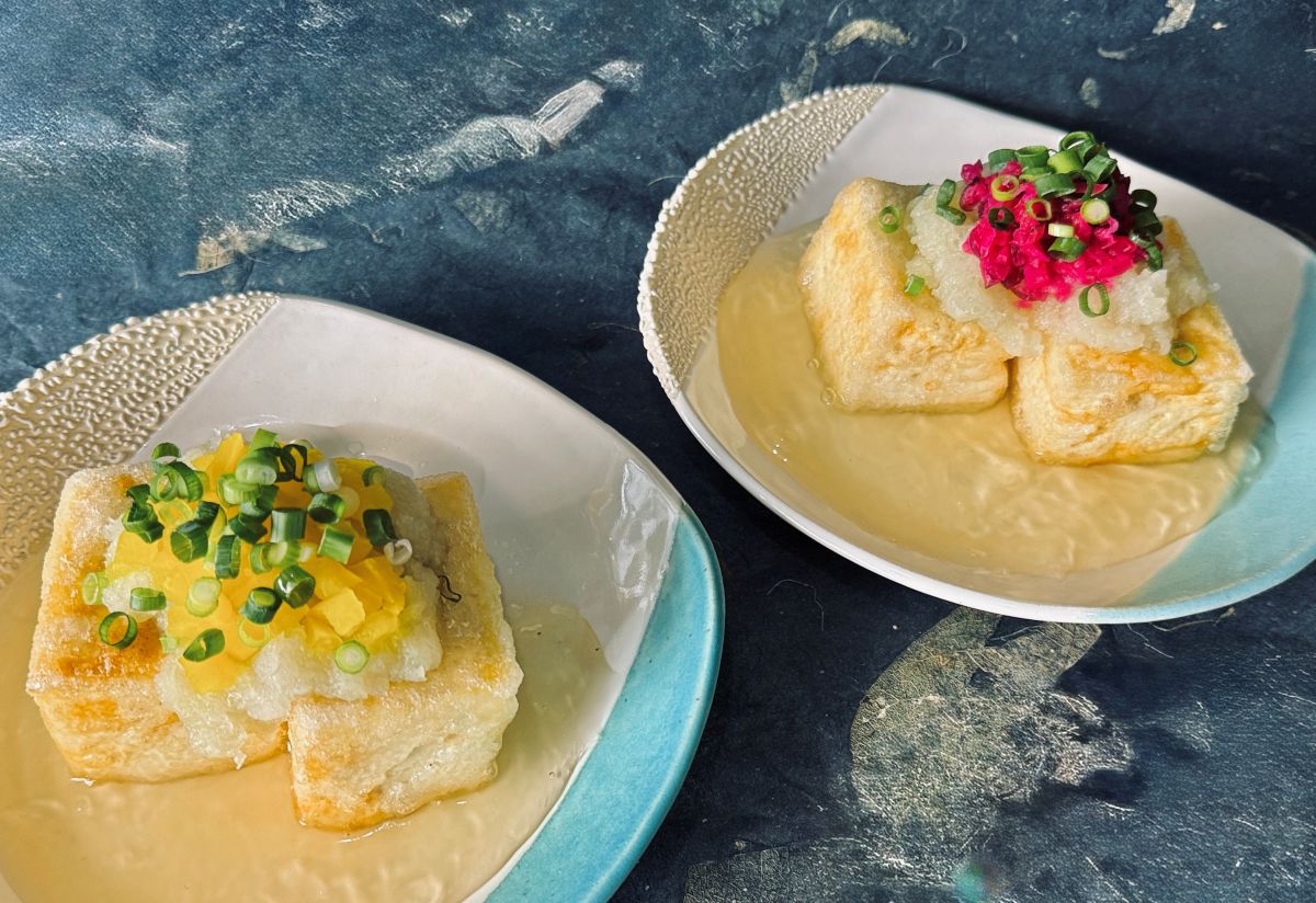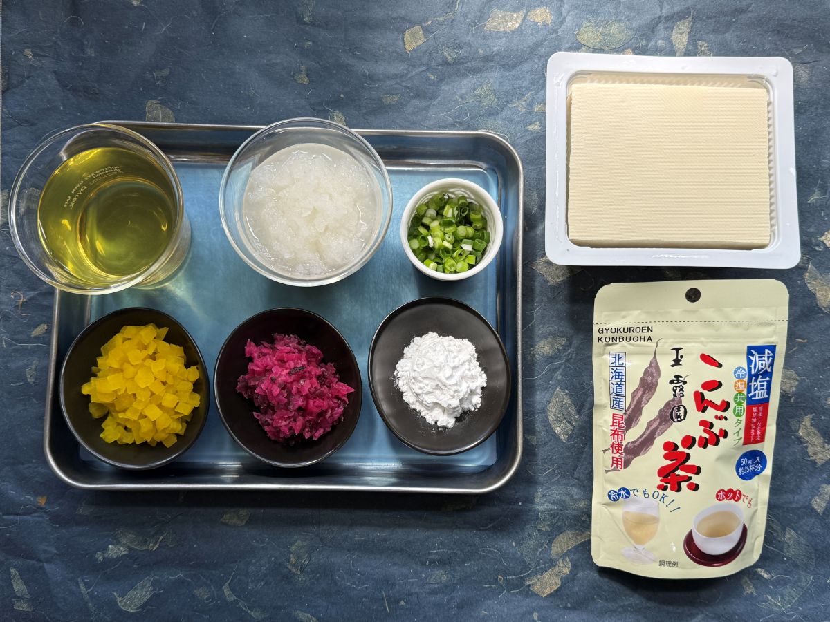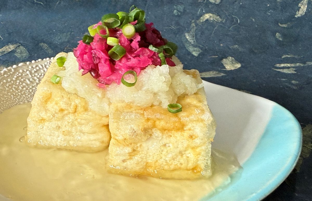 おなじみの揚げ出し豆腐をアレンジ。大根おろしに「玉露園 減塩昆布茶」を加えて昆布のうま味を効かせ、和風あんかけにはカツオ出汁を使い、食べたら合わせ出汁。漬物のコリコリした食感がよいアクセント。目と食感の両方で楽しめます。 |