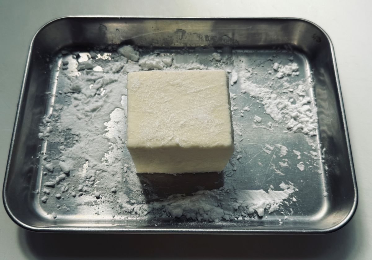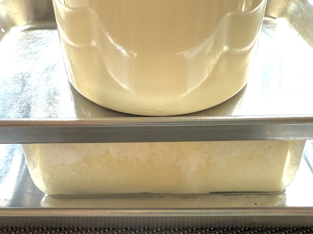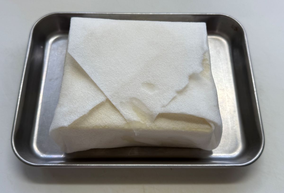 (1)木綿豆腐は厚手のキッチンペーパーに包んで重石をのせ、30分程おいて水気をしっかりおさえる