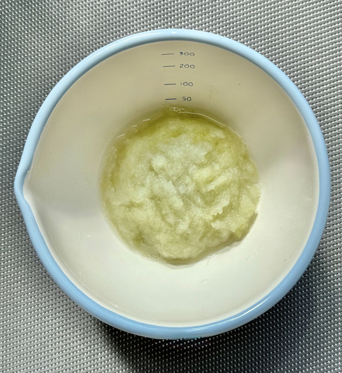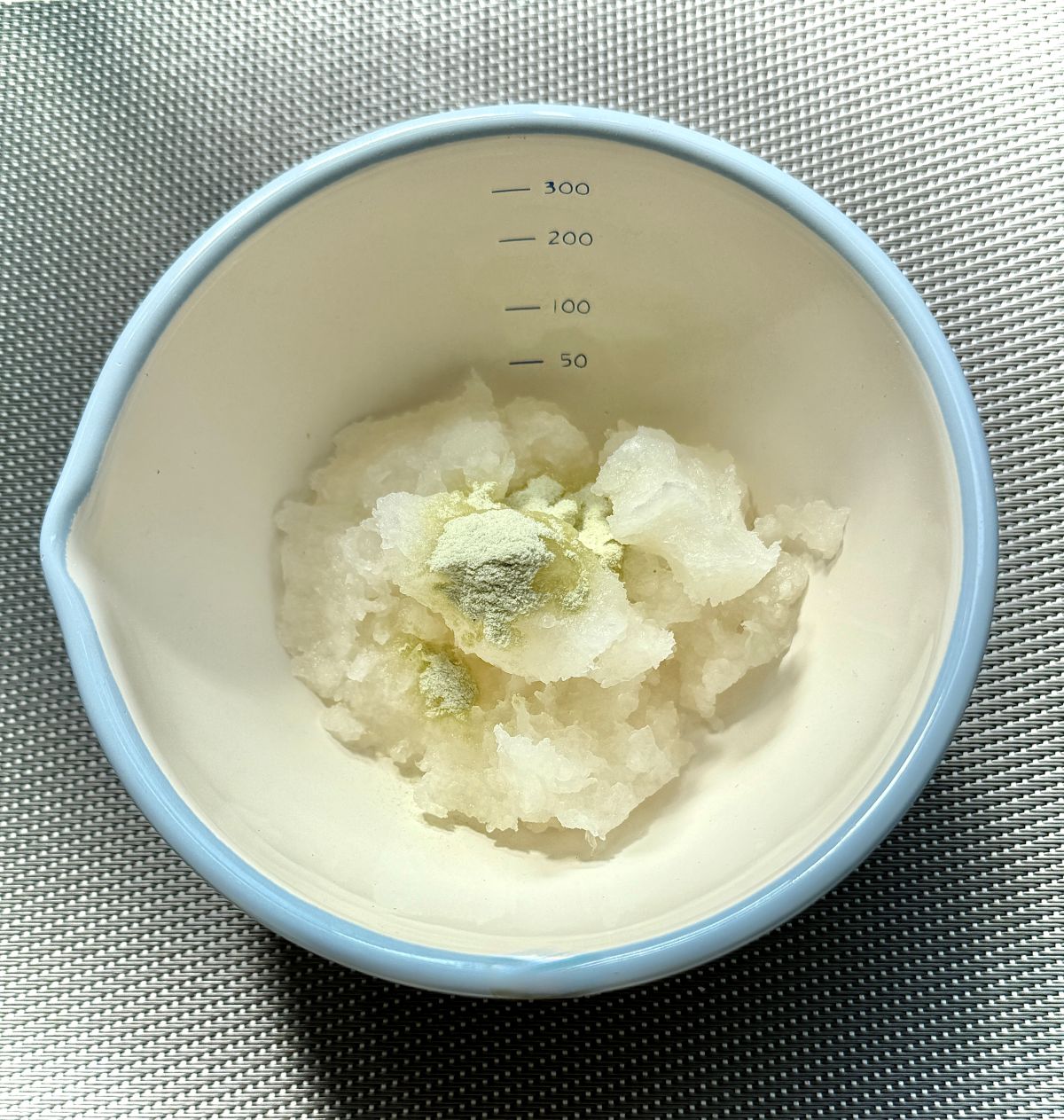 (4)大根おろしは半分の量になるくらいに水気を絞り、減塩昆布茶を加えてスプーンなどでよく混ぜる