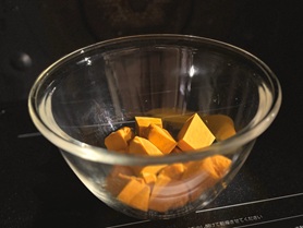 (1)かぼちゃを一口大に切り、レンジでやわらかくなるまで加熱する